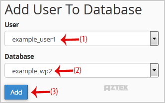 3. Scroll down to the end of the page and under "Add User to Database", select a user from the dropdown list, and then choose a Database from the list.