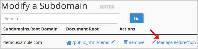 4. Click the "Manage Redirection" link that corresponds to the subdomain that you wish to manage.