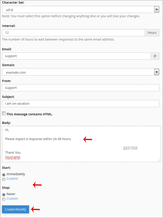 7. In the subject field enter your e-mail subject like "I am on vacation", etc.