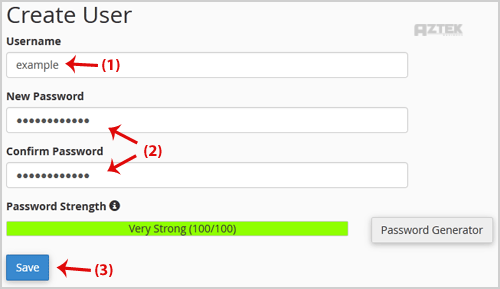7. Scroll down the page and under "Create User" fill in the username and password fields or use the Password Generator option to generate a new random password and copy the user/password to a notepad. You will need this when you want to open your password-protected directory and click on the "Save" button.