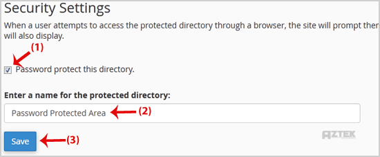 5. Under "Security Settings", check the box next to "Password protect this directory" and enter a name for the protected directory like "Password Protected Area". Then click the "Save" button.