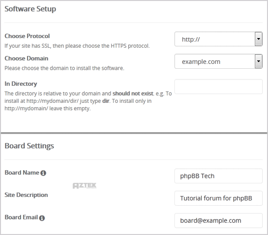 - In Directory: If you want to install this in a directory, for example example.com/forums, enter the directory name. Otherwise, leave this blank to install in your main domain example.com