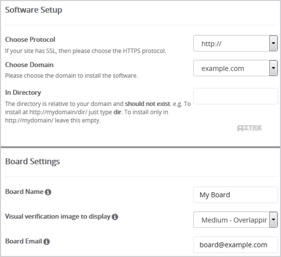 • In Directory: If you want to install this in a directory, for example example.com/forums, enter the directory name. Otherwise, leave this blank to install in your main domain example.com