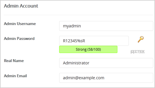 8. Under the "Admin Account" field enter the following information: