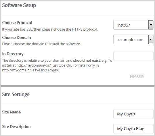 - Admin Username: Your new Chyrp username (for security reason do not use the "Administrator" or the "Admin" username.)
