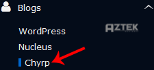 4. On the left side of your screen you should locate the "Blogs" category. Click on it and then click on the "Chyrp" link that will appear.