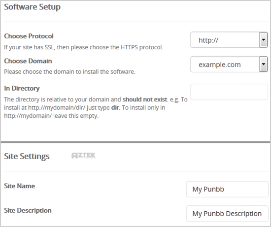 - In Directory: If you want to install this in a directory, for example example.com/forum, enter the directory name. Otherwise, leave this blank to install in your main domain example.com