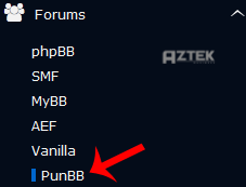 4. On the left side of your screen you should locate the "Forums" category. Click on it and then click on the "PunBB" link that will appear.