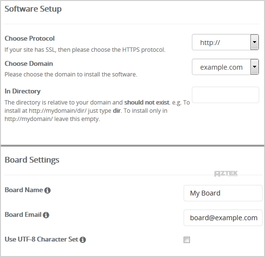 - In Directory: If you want to install this in a directory, for example example.com/forum, enter the directory name. Otherwise, leave this blank to install in your main domain example.com