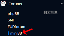 5. On the left side of your screen you should locate the "Forums" category. Click on it and then click on the "miniBB" link that will appear.