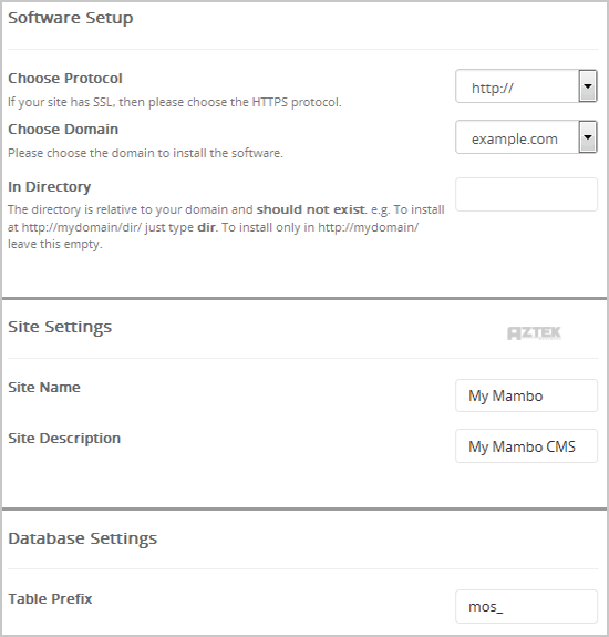 - In Directory: If you want to install this in a directory, for example example.com/directory, enter the directory name. Otherwise, leave this blank to install in your main domain example.com