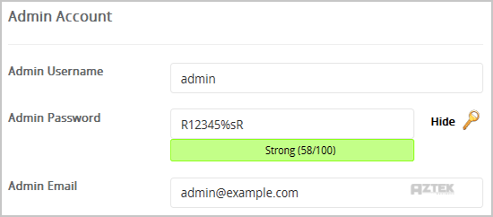 - Admin Username: Your new ProcessWire username (for security reason do not use the "Administrator" or the "Admin" username.)