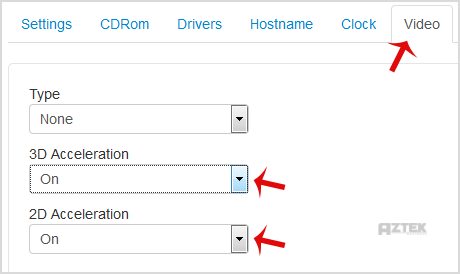 1. Scroll down under the "Video" tab, and if you want to Disable the 3D Acceleration, choose the option "Off" from the dropdown menu.If you want to enable it, chose the "On" option from the 2D/3D Acceleration.