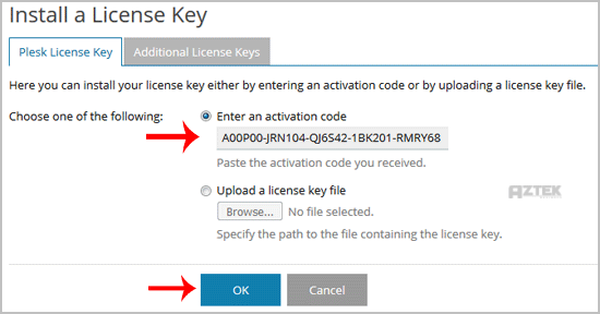 Step 7: Now click on "Install Key", enter your Plesk Activation code and press ok to save it. You can also use a trial key or use your own key.
