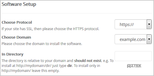 - In Directory: If you want to install this in a directory, for example example.com/directory, enter the directory name. Otherwise, leave this blank to install in your main domain example.com
