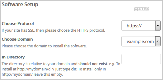 • In Directory: If you want to install this in a directory, for example example.com/directory, enter the directory name. Otherwise, leave this blank to install in your main domain example.com